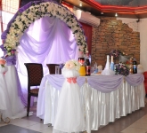 Свадебная арка, белые скатерти и юбки для столов, кованные стойки с цветами и фатином, чайный стол, цветочные композиции, деревья и многое другое...